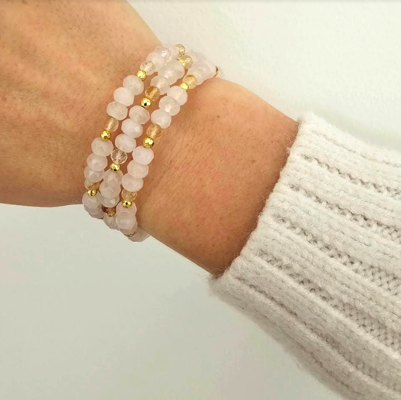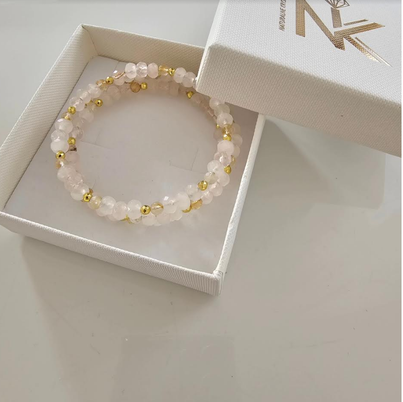 Bransoletka z naturalnego kwarcu różowego z cytrynem i hematytami, wykonana na drucie pamięciowym, który oplata się wokół nadgarstka
