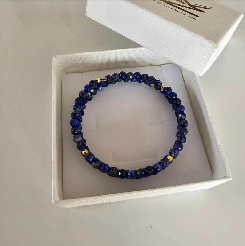 Bransoletka z lapisem lazuli i hematytami, rozmiar uniwersalny, wykonana na drucie pamięciowym, którą owija się wokół nadgarstka, jest bardzo łatwa w zakładaniu i zdejmowaniu