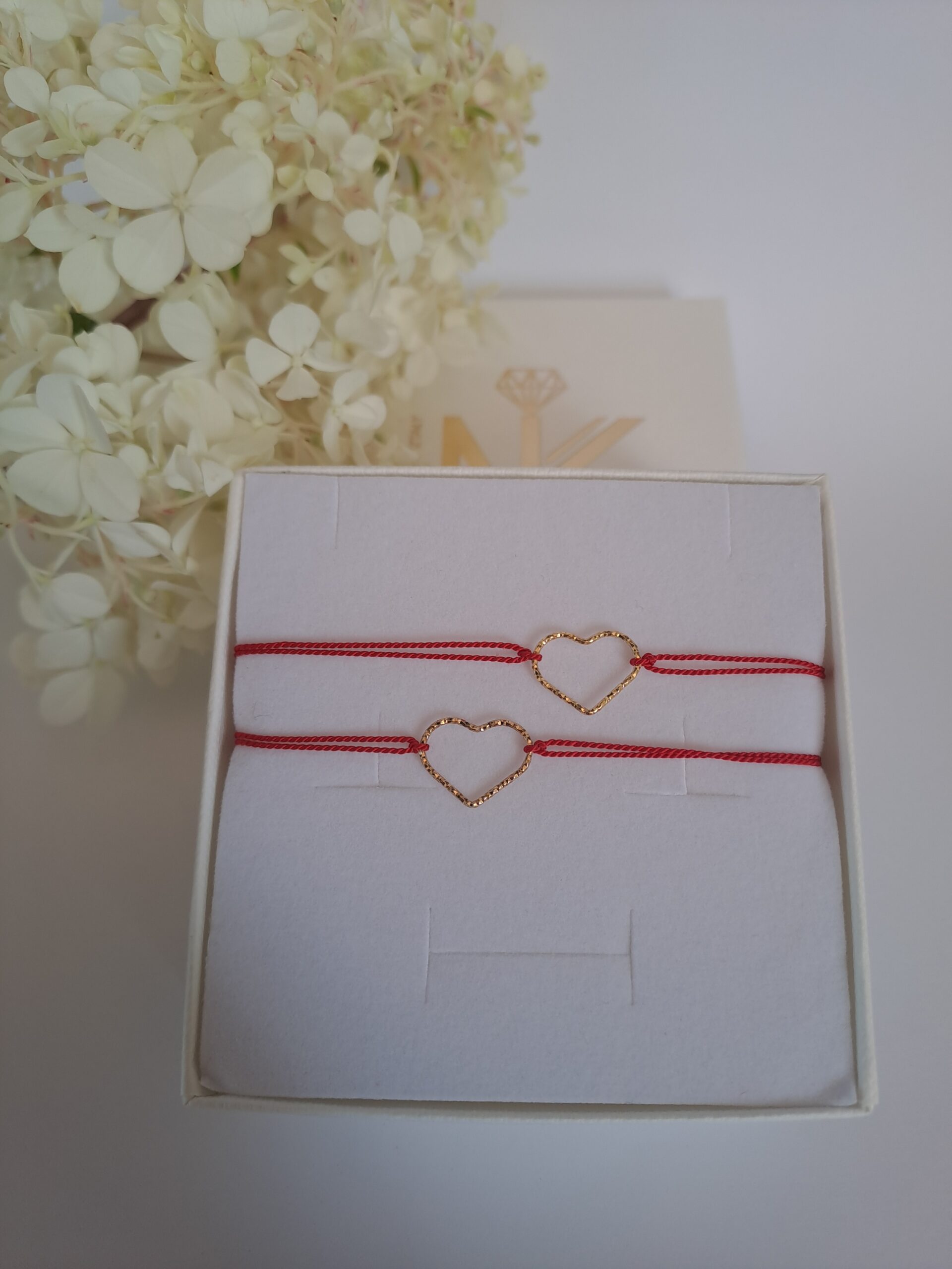 Bransoletki na czerwonej nici ze srebrnym pozłacanym sercem ,cena obejmuje 2 bransoletki