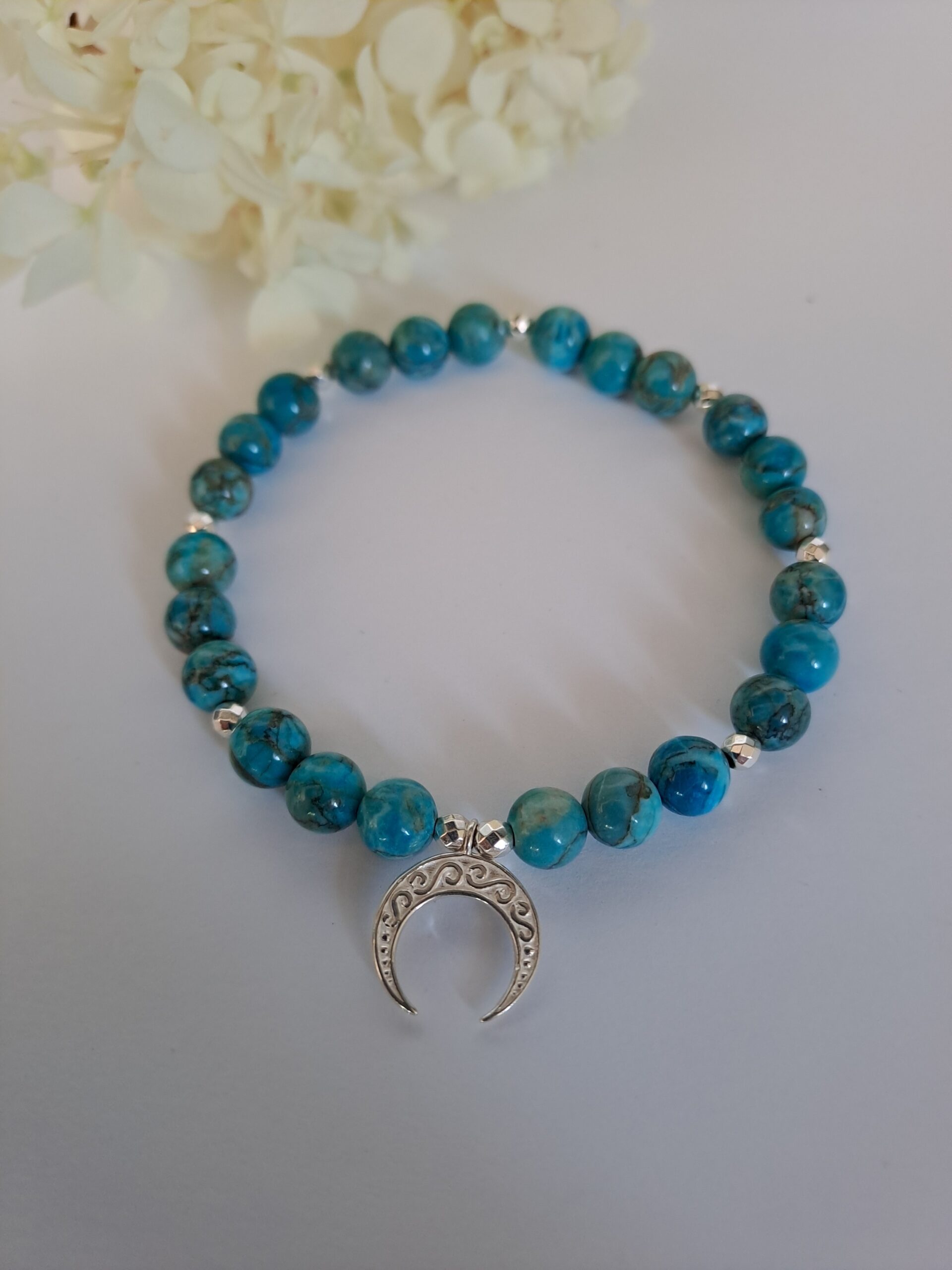 Bransoletka z jaspisem niebieskim i hematytami ze srebrną zawieszką róg obfitości, obwód 18 cm