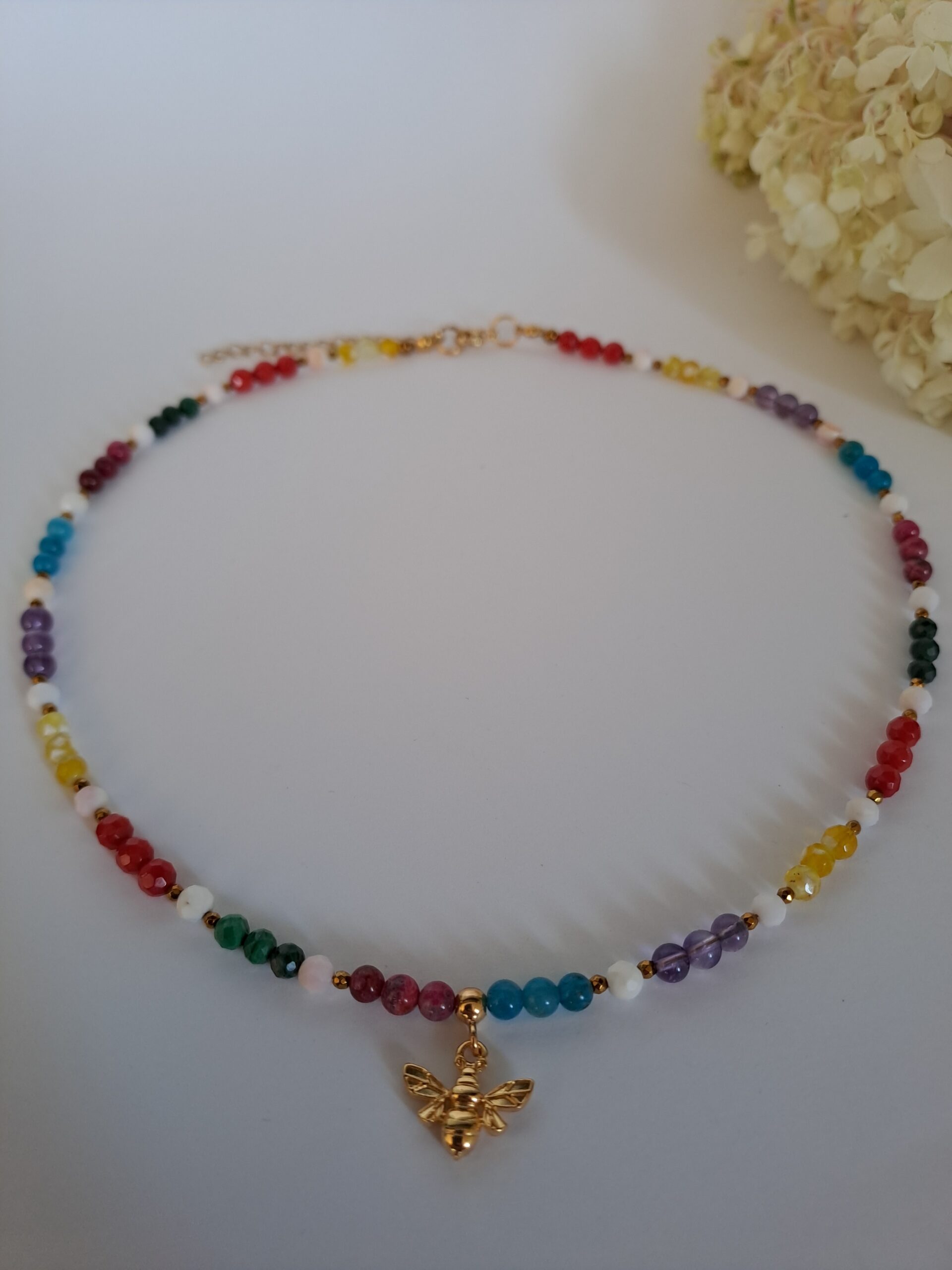 Naszyjnik z koralem, agatem, ametystem, apatytem, malachitem, muszlą,
